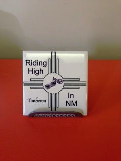 Nice, laser-cut 4-inch ceramic tile with the Zia symbol, a motorcycle, and the words “Riding High In NM, Timberon”. Black on white. Price: $8.00 plus tax